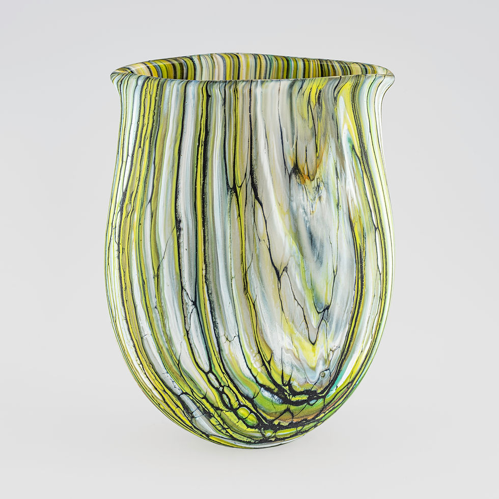 This iconic and ever-popular design is unique to Isle of Wight Studio Glass, and requires a team of two glassmakers. The method is complex, but in outline, a multicoloured striped layer of glass is fashioned and then pushed over the surface of a core of shaped clear glass, furnishing the effect of the strata seen in sedimentary rocks.